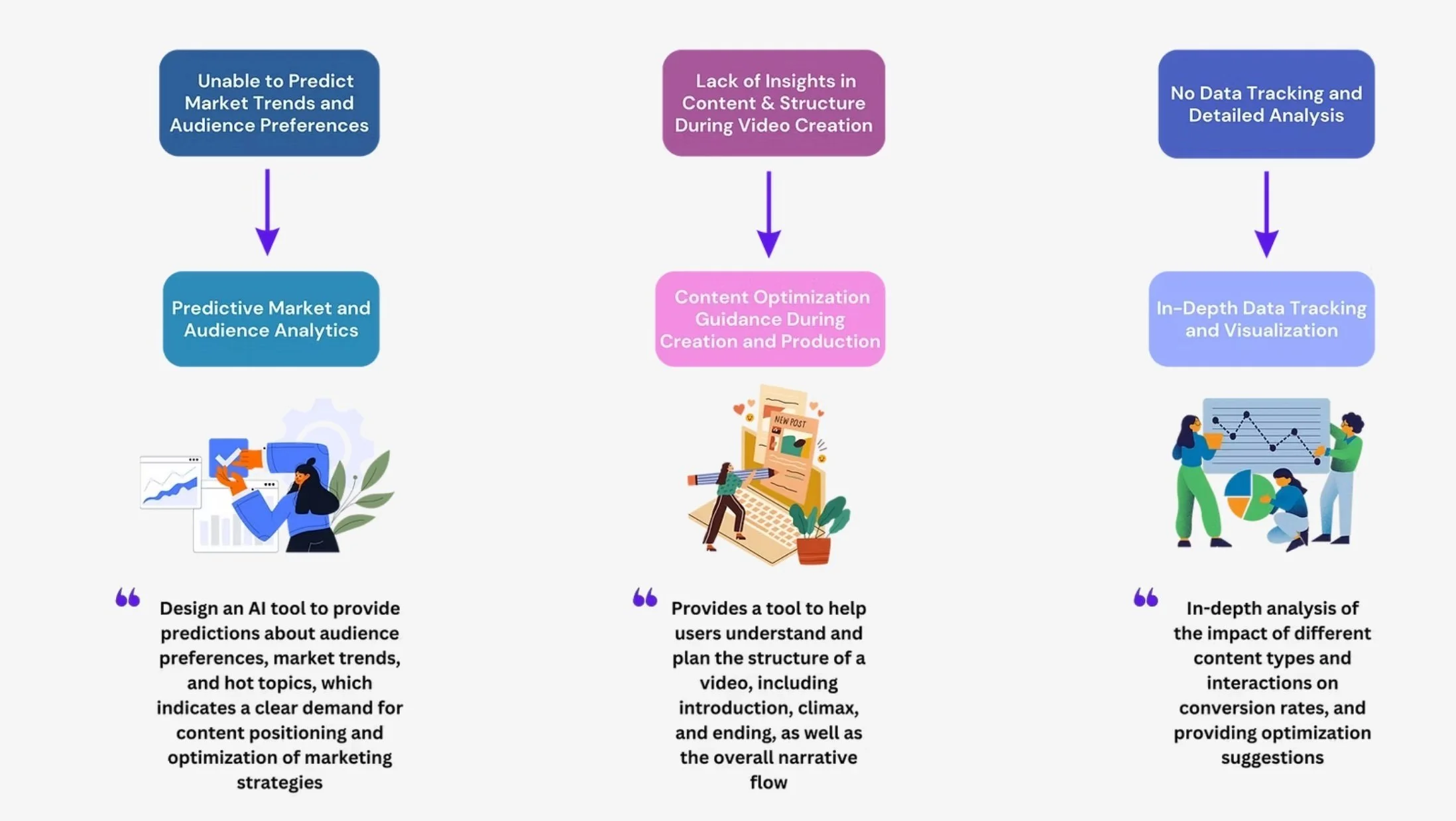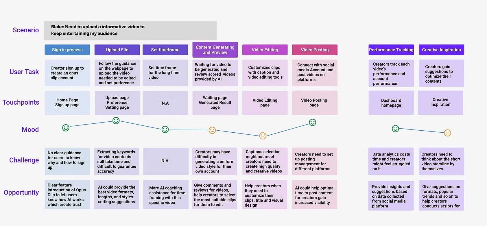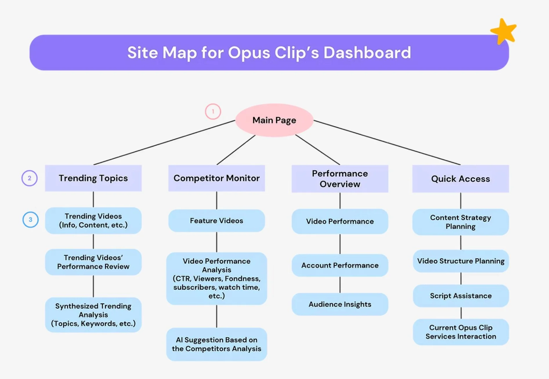 After a thorough study of the user's video production process and user pain points, combined with Opus Clip'needs, we determined our design will focus on three aspects: Predict Market Trends, Provide Insights in Contents, and Video Data Analysis.